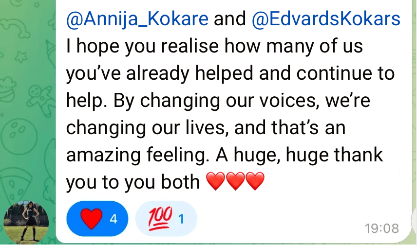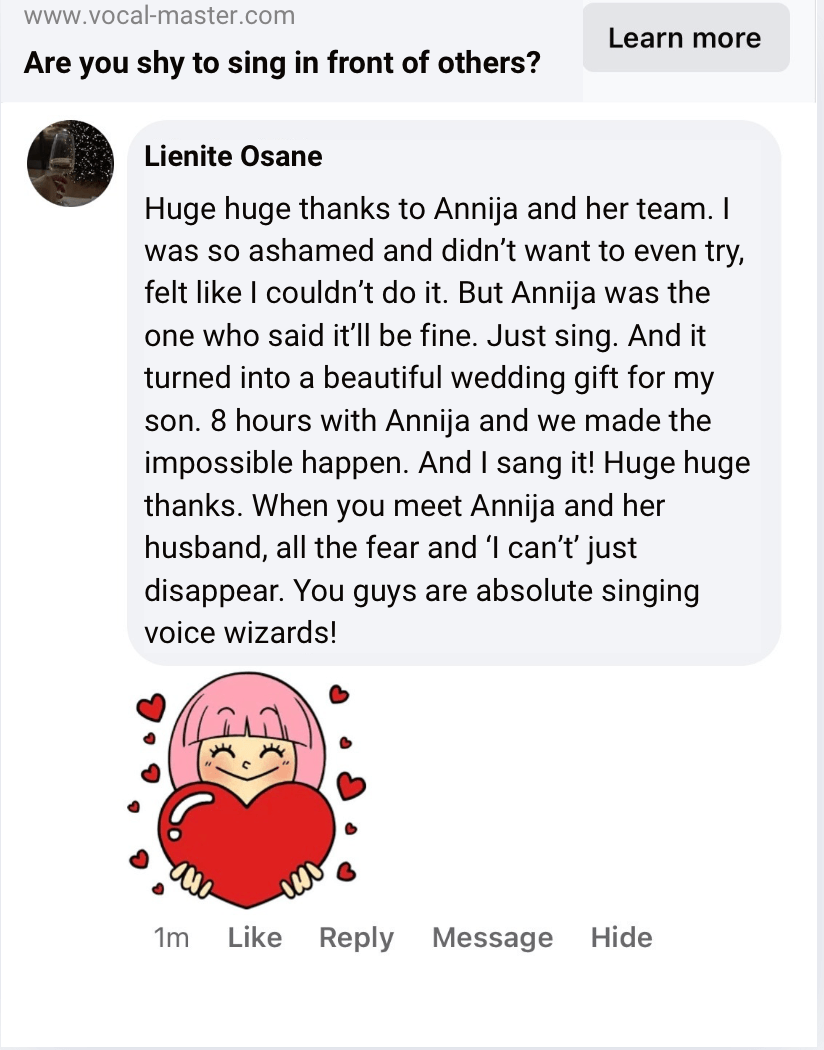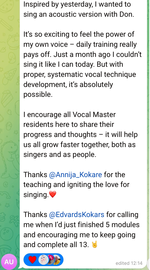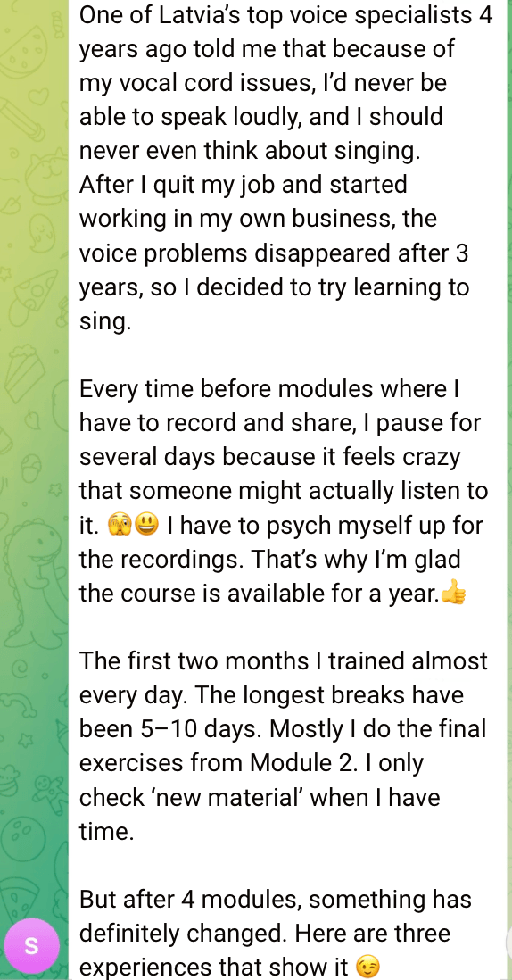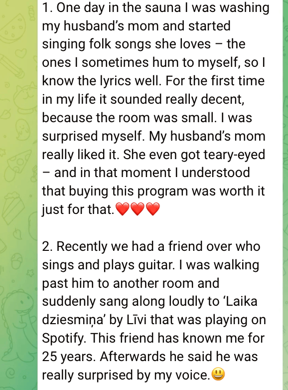 āI am very grateful to the āVocal Masterā team, and especially to Annija, for creating this course. Every lesson is worth every euro paid!