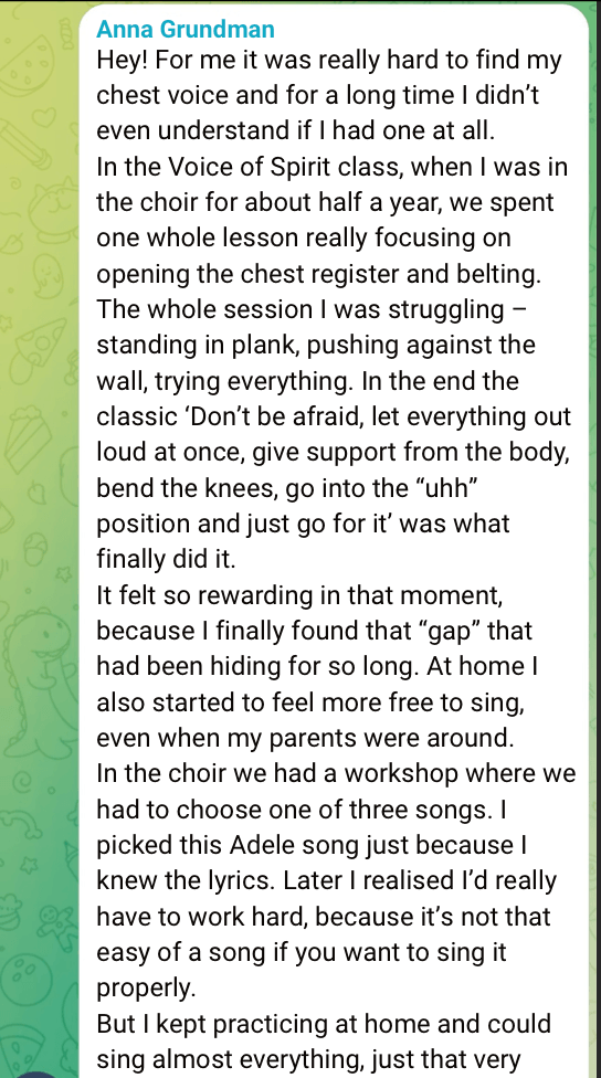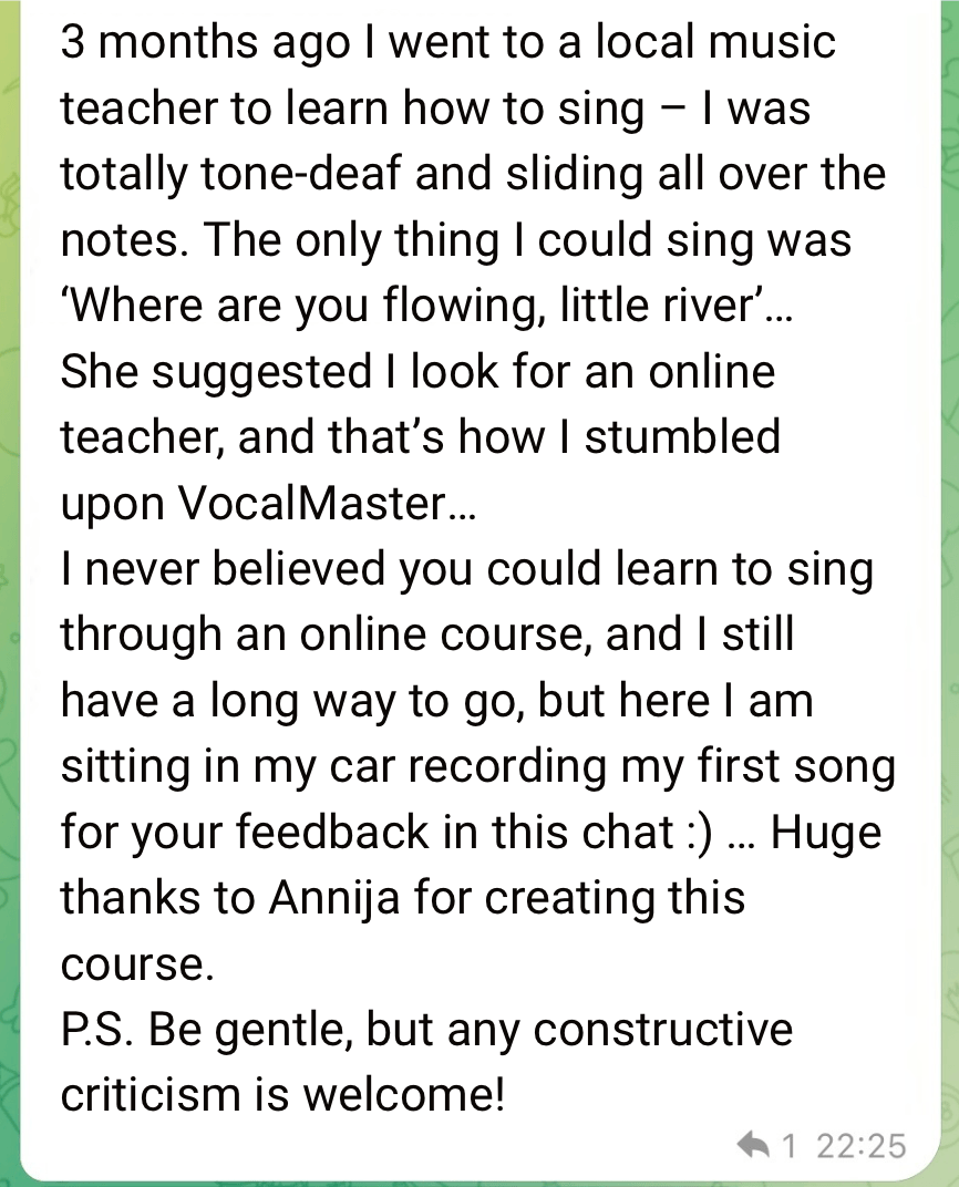 āI jumped into the Vocal Master course with great enthusiasm. One of its biggest advantages was that the training is online ā I could practise whenever and wherever I wanted: at home, in the forest, by the sea. Each module, each exercise brought new discoveries about my voice. I began to understand where and how singing feels easier.